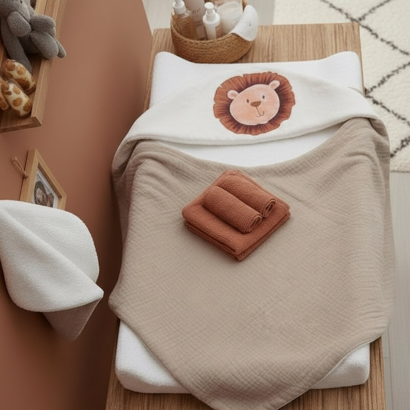 La cape de bain bébé lion est pensée comme un essentiel du quotidien, capable d’allier caractère et douceur. Le lion est ici représenté de manière graphique et rassurante, loin des motifs trop marqués. J’ai dessiné ce motif pour qu’il inspire confiance et stabilité, tout en restant accessible à l’univers du tout-petit.